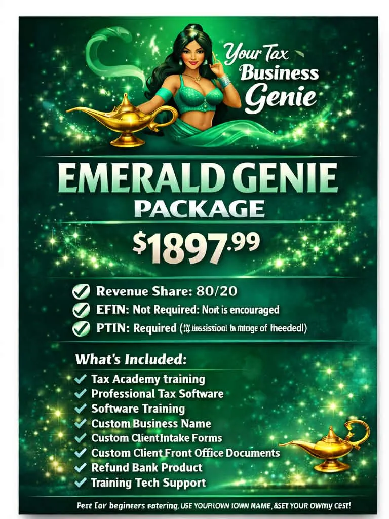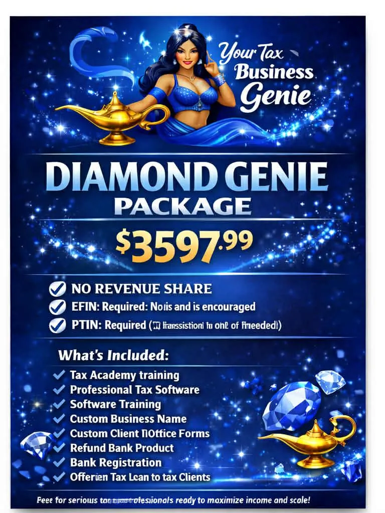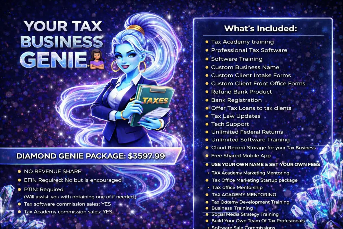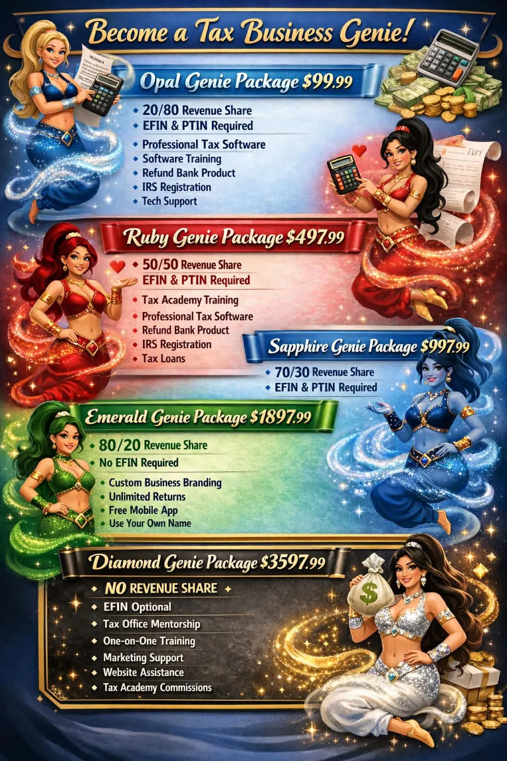 Your Tax Business Genie is here to get you set up for success. with this all inclusive software we have made multiple packages to benefit any tax professional. Whether you are just starting your tax business or you have been running multiple tax offices for years, we strive to better your situation and advance your business. Let us help you! Your wish is our command.