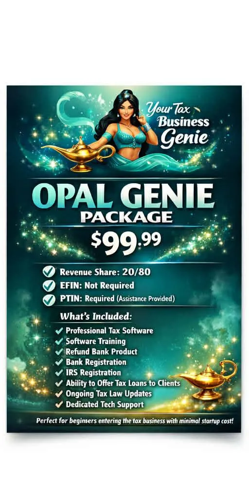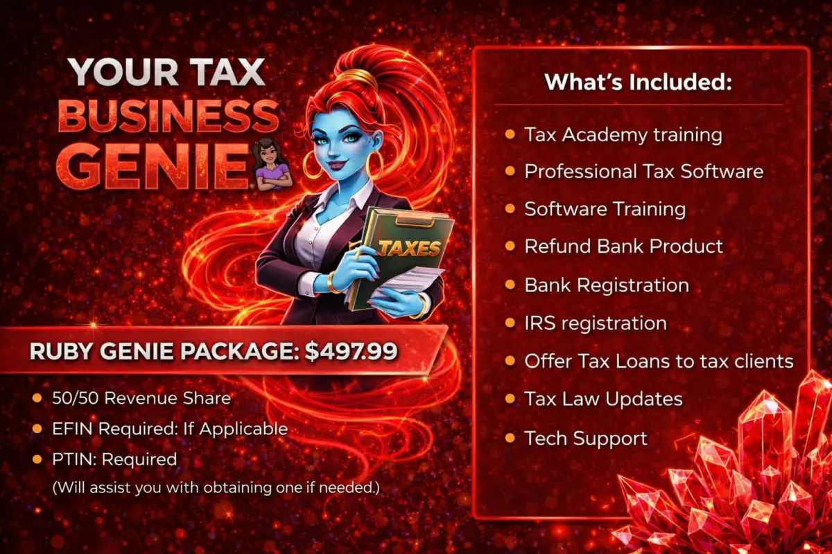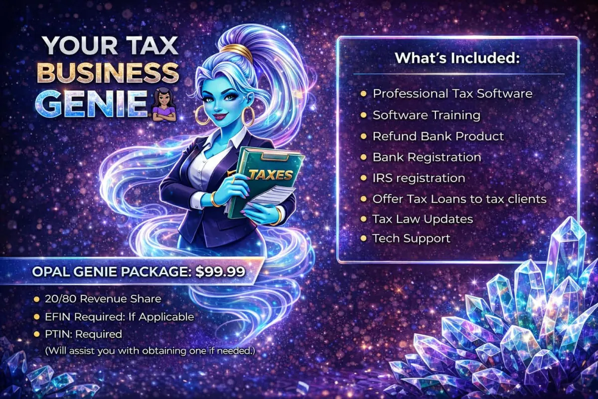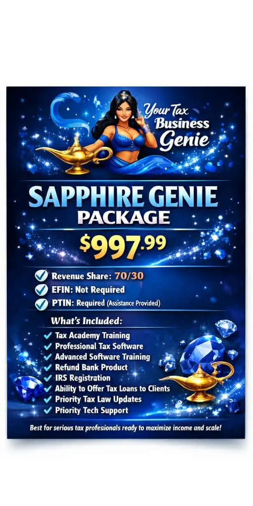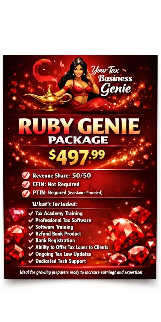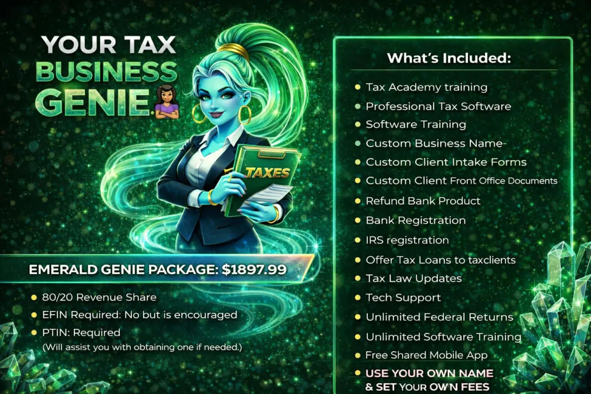 Your Tax Business Genie is here to get you set up for success. with this all inclusive software we have made multiple packages to benefit any tax professional. Whether you are just starting your tax business or you have been running multiple tax offices for years, we strive to better your situation and advance your business. Let us help you! Your wish is our command.